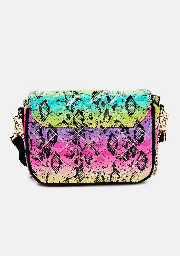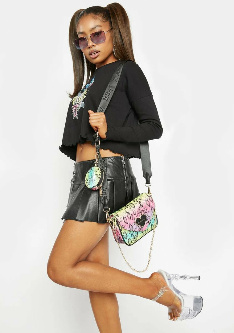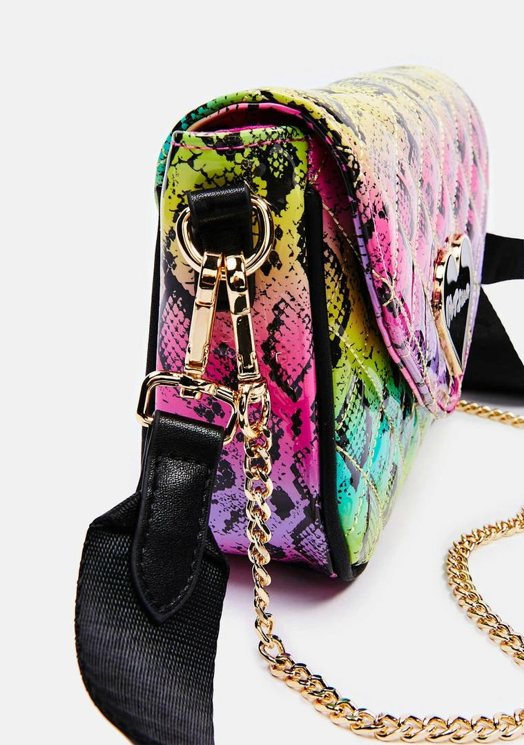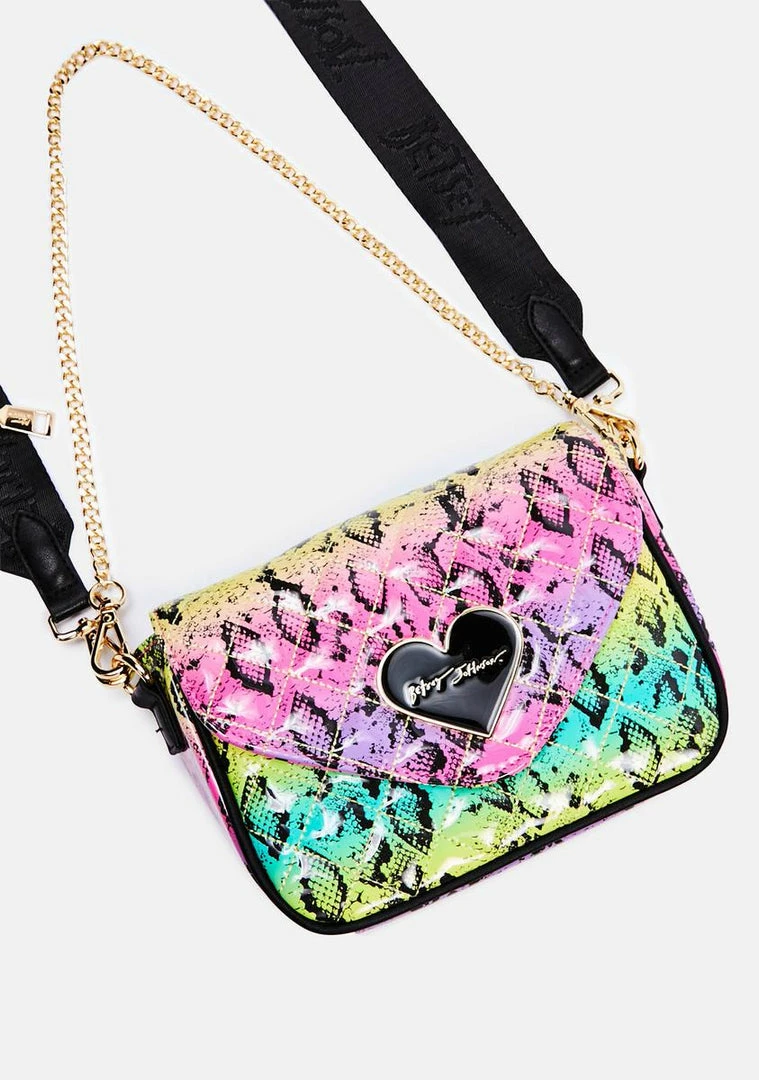 has a patent quilted design, a foldover flap with an enameled Betsey Johnson logo heart, an ombre snake print, a chain strap, and an embossed canvas crossbody strap with a detachable circle pouch.