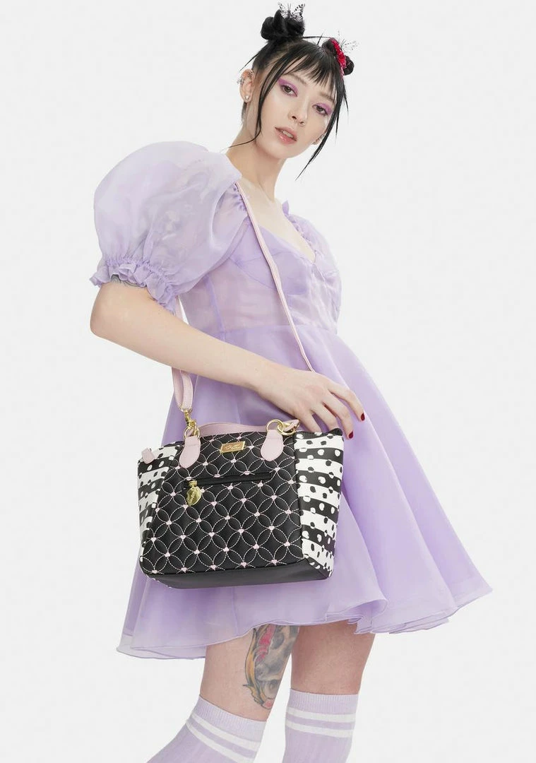 features double top straps, top and side zipper closures, quilted fabric design, heart pattern all over.