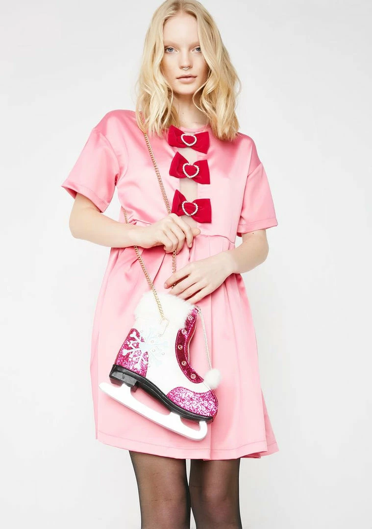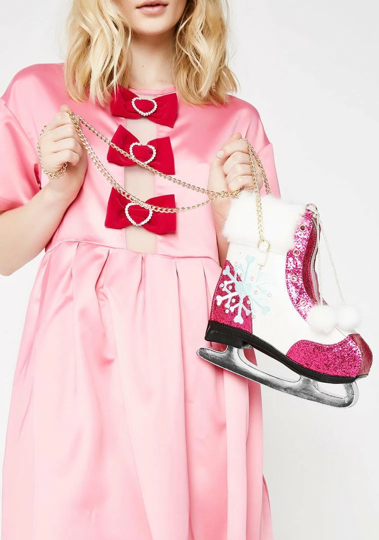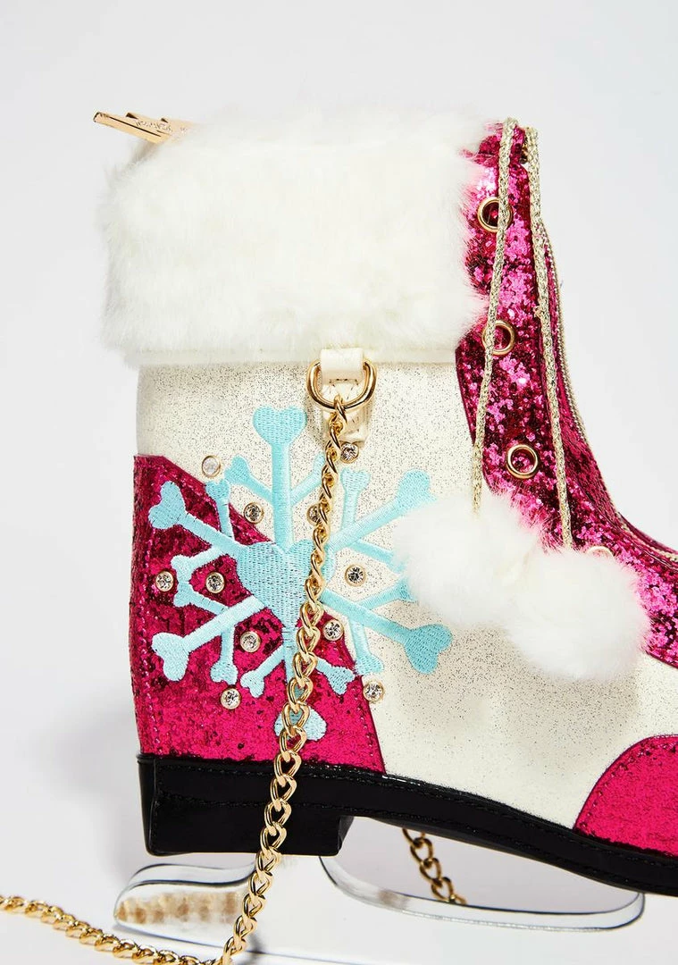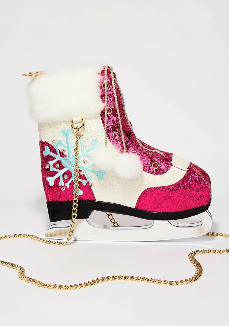 cuz youΓ’ΒΒre just skating through all the drama. Keep ya spiritz up with this ice skate shaped bag that has glitter all ova, faux fur trim, a snowflake on the side, a gold chain strap and a zip closure.