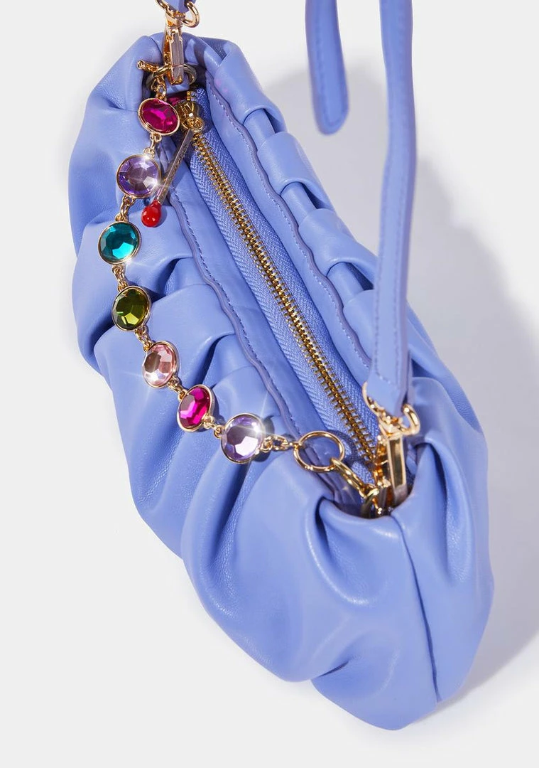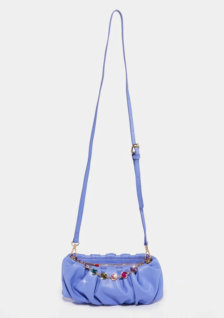 because we’re gonna go all night. This bag has a vegan leather construction, detachable crossbody strap, and a chain detail with chunky jewels.