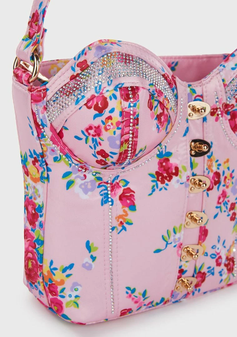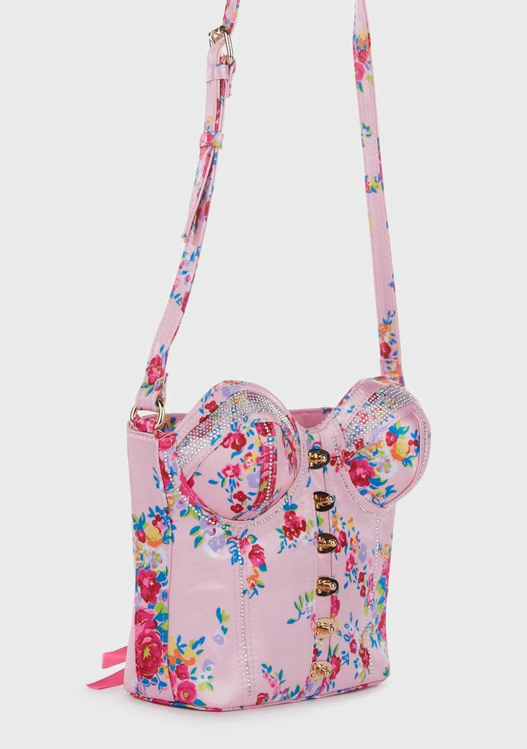 don’t have to ask me twice. This bag comes in a vegan leather corset construction, with a floral print all over, crossbody strap, zip closure, rhinestone details, and corset lacing at back.