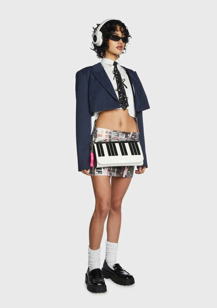 cuz you always leave them wanting more. This bag comes in a vegan leather piano key construction, with a music note keychain, flap closure, and crossbody strap.