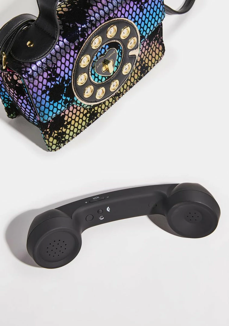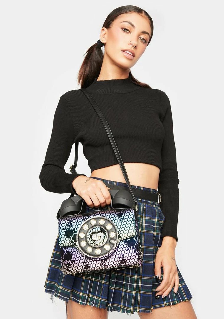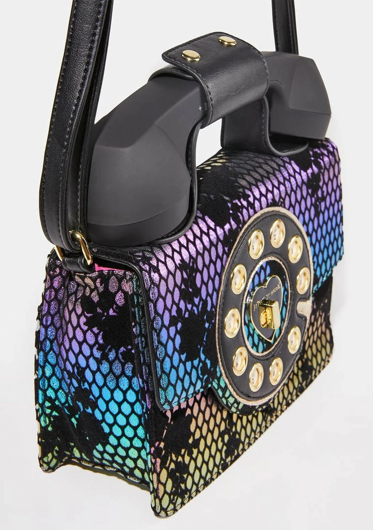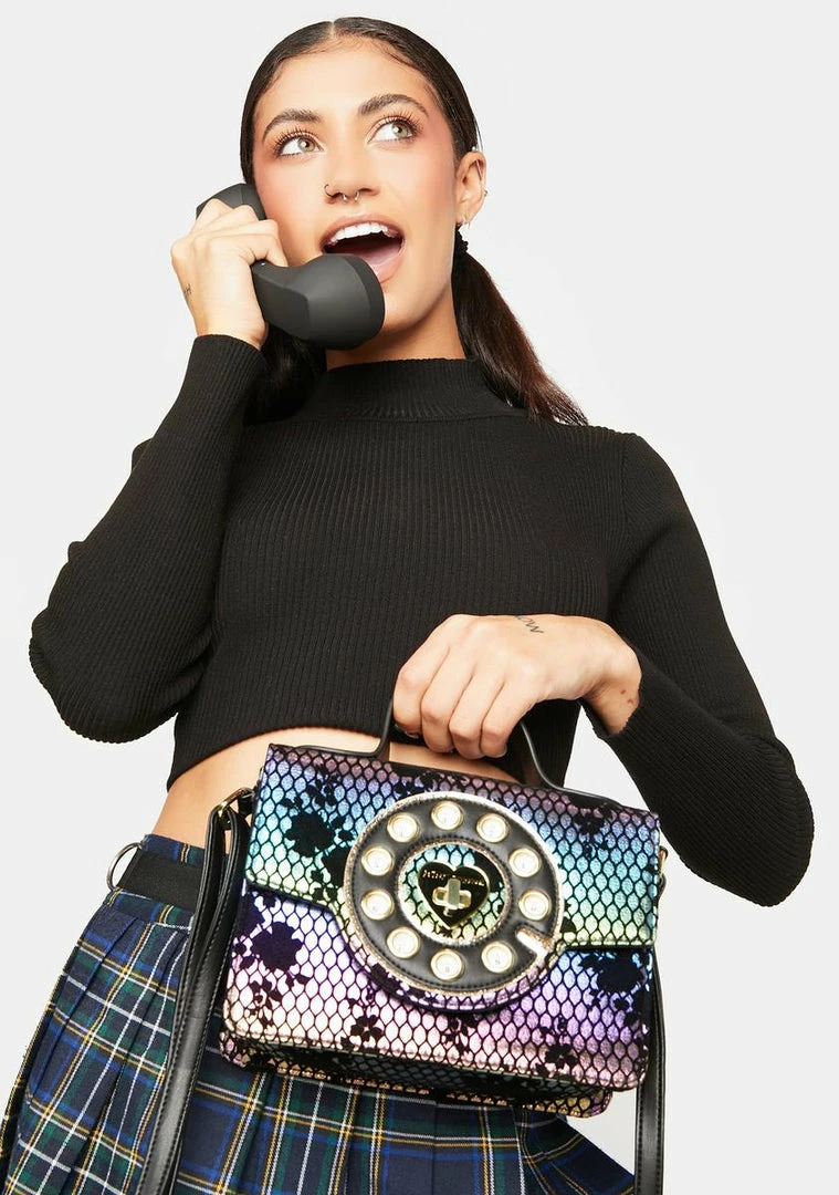 cuz new phone who dis. This vegan leather crossbody bag has an adjustable shoulder strap, a back zipper pocket, a turn lock closure, and is in the shape of an old school telephone with a cordless phone.