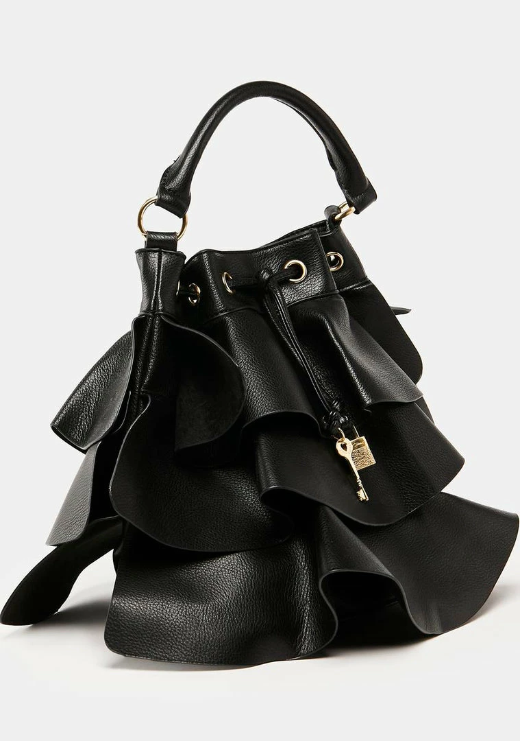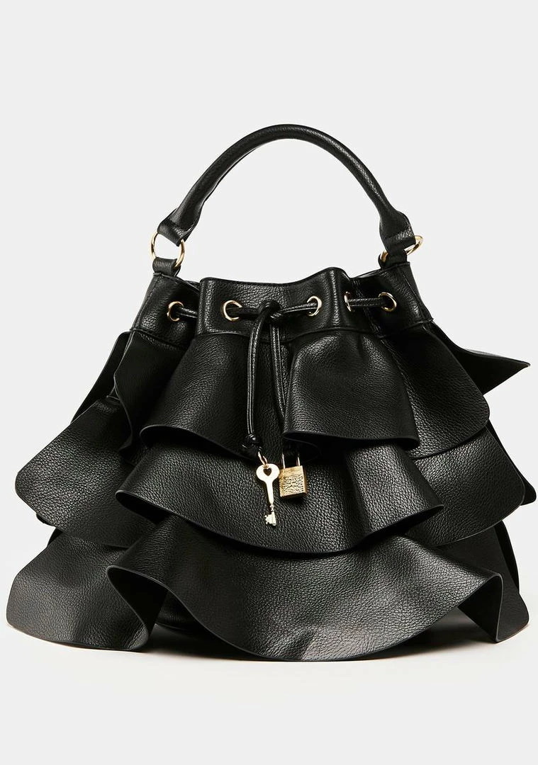let your handbag do the talking. This bucket bag has a vegan leather construction, tiered ruffles, a drawstring closure with lock and key charms, a top handle, and an adjustable and removable crossbody strap.