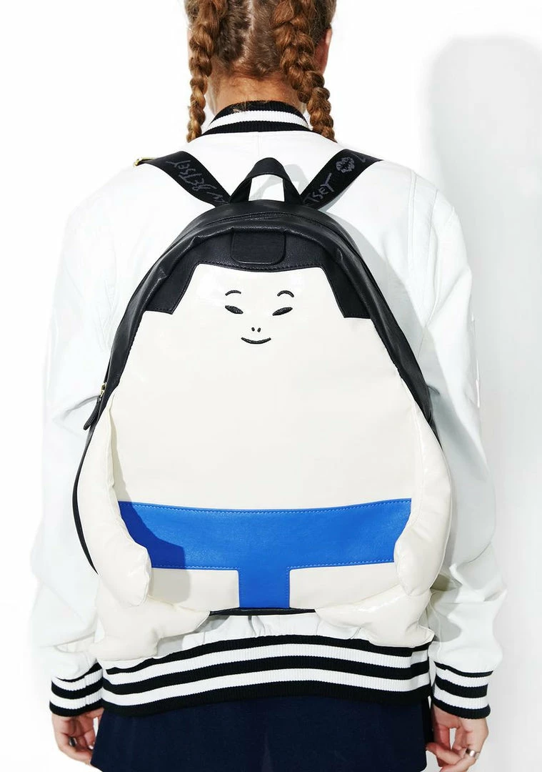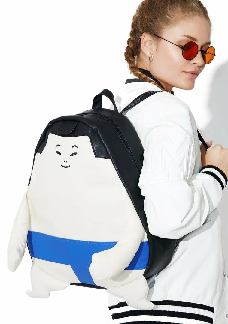 yr a take-no-prisoners type of chick when this hunky sumo dudeΓ’ΒΒs got your back! This tuff backpack features a squishy sumo wrestler shaped base with blue contrast, top zip closure, and adjustable shoulder straps.