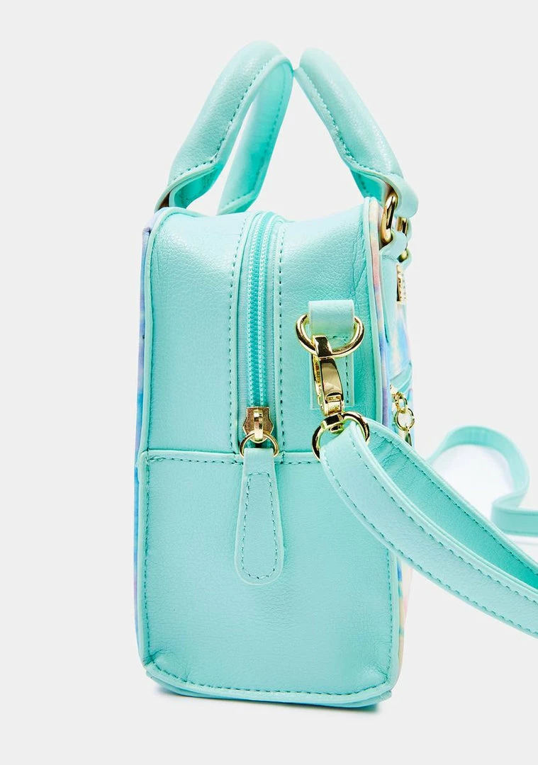has a vegan leather construction with a tie dye print all over, a front pocket with a metallic lips shaped zipper, a metallic engraved logo patch, double upper handles, and a zipper closure on top.