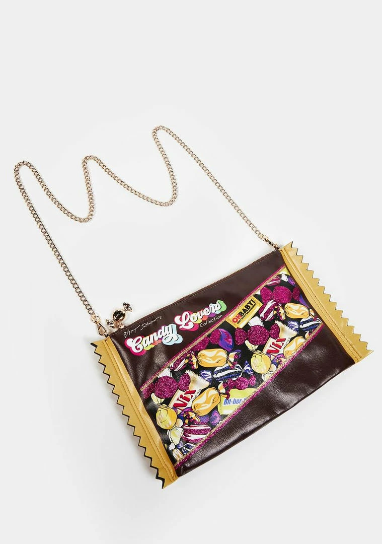 for your sweet tooth. This candy shaped bag can be used as a crossbody or clutch with a detachable gold chain and top zip closure.