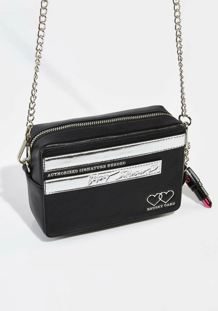 cuz money can’t buy me love. Show your love for the ultimate plastic in this crossbody bag in the shape of a credit card which has a vegan leather construction, a detachable shoulder strap, metallic hardware, and a top zip closure.