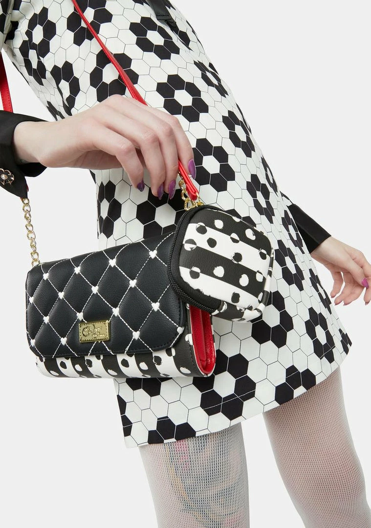features a polka dot striped bag body, quilted domed upper with metallic heart studs, double top handles and chain shoulder strap, and Betsey Johnson metallic logo patch.