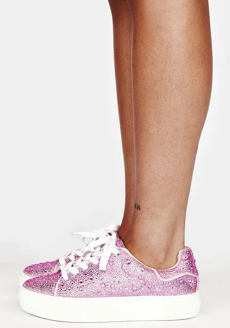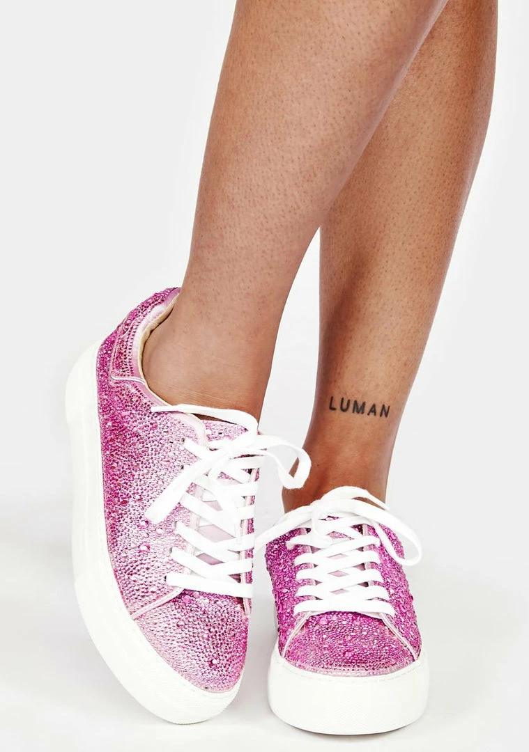 have a chunky rubber platform sole, a rhinestone encrusted upper, a low ankle rise, and a lace up closure in front!