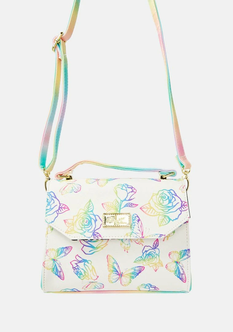 features a foldover top flap construction, holographic butterfly and rose print all over, and a detachable crossbody strap.