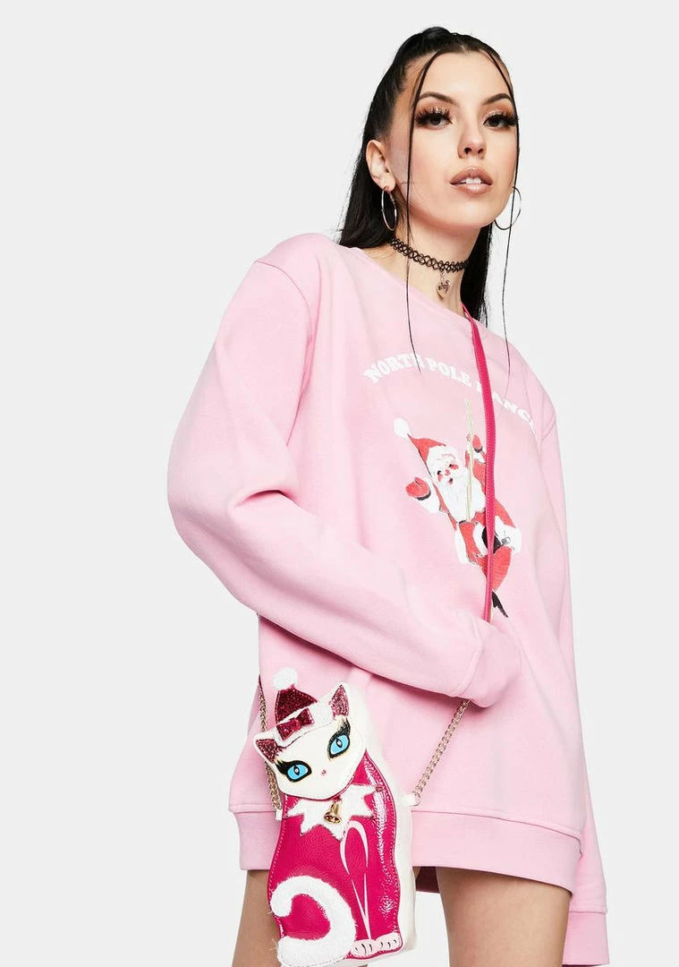 meow! This glittery crossbody bag has a sassy holiday cat design with an adjustable shoulder strap and a top zip closure.