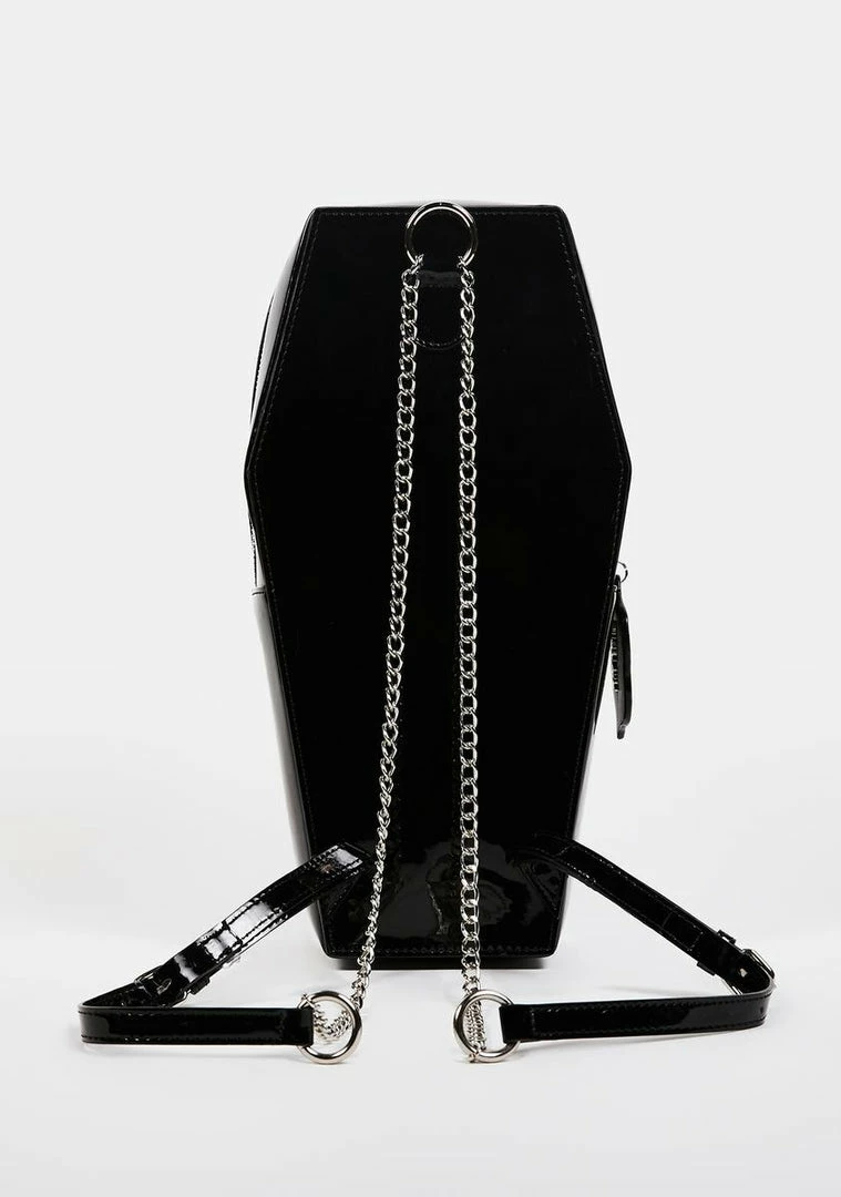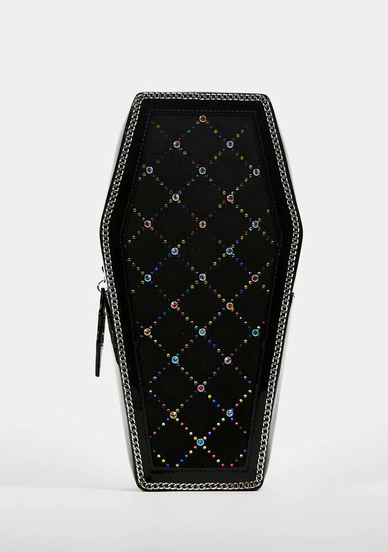 for the ghoul in you. This coffin shaped backpack has multi colored rhinestones on the front, a silver chain border, adjustable silver chain and leather straps, and a top zip closure.