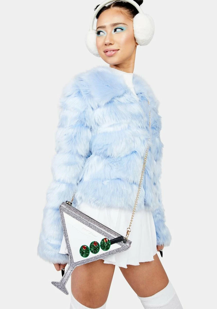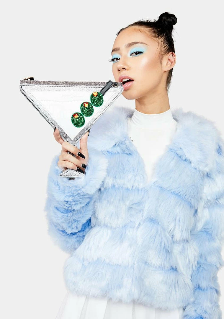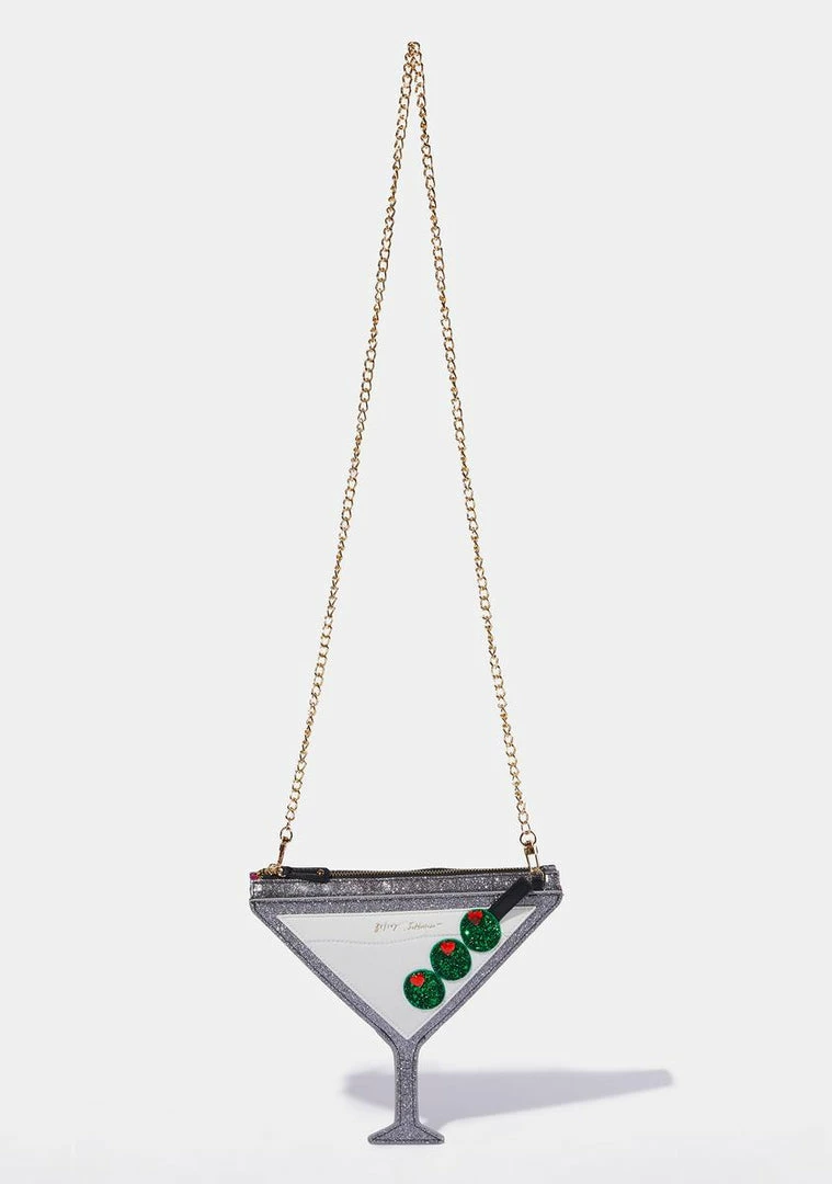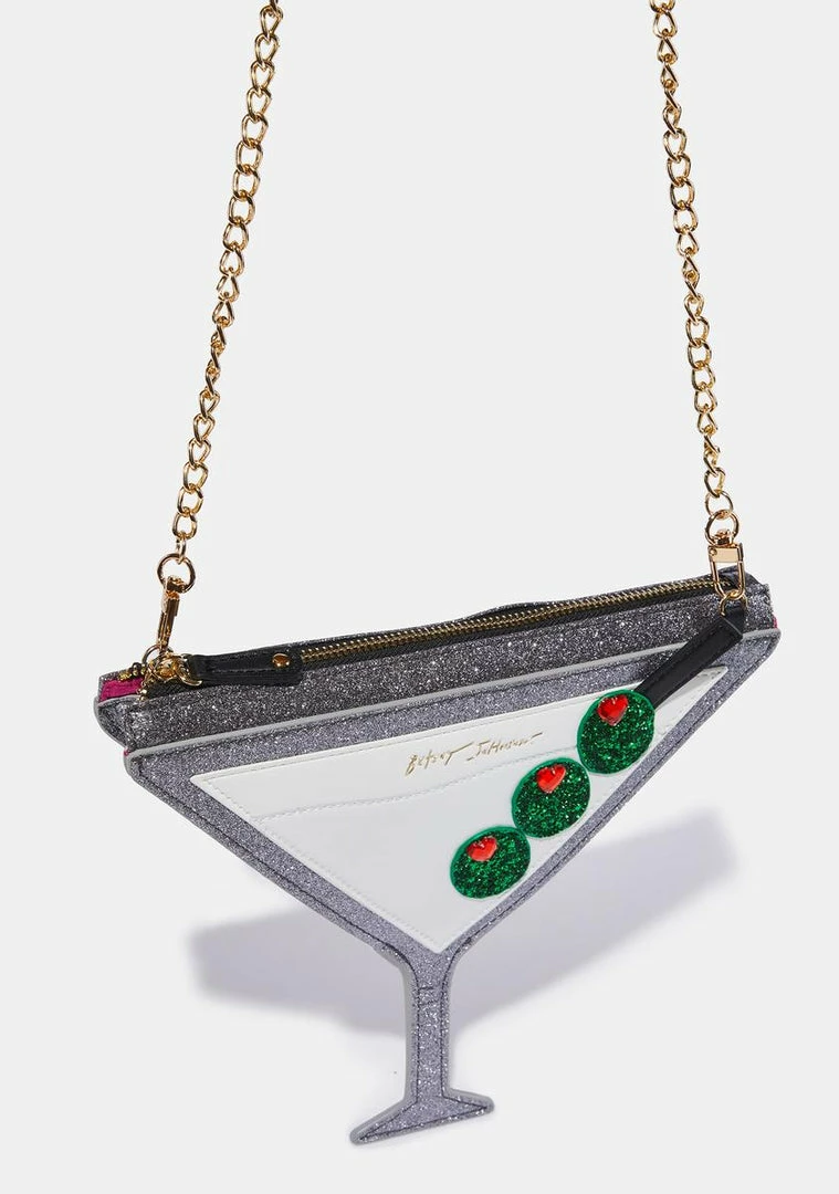 cuz shaken not stirred. Make it a dirty martini night in this crossbody bag which has a vegan leather construction, is in the shape of a martini drink, has a detachable gold chain shoulder strap, and a top zip closure.
