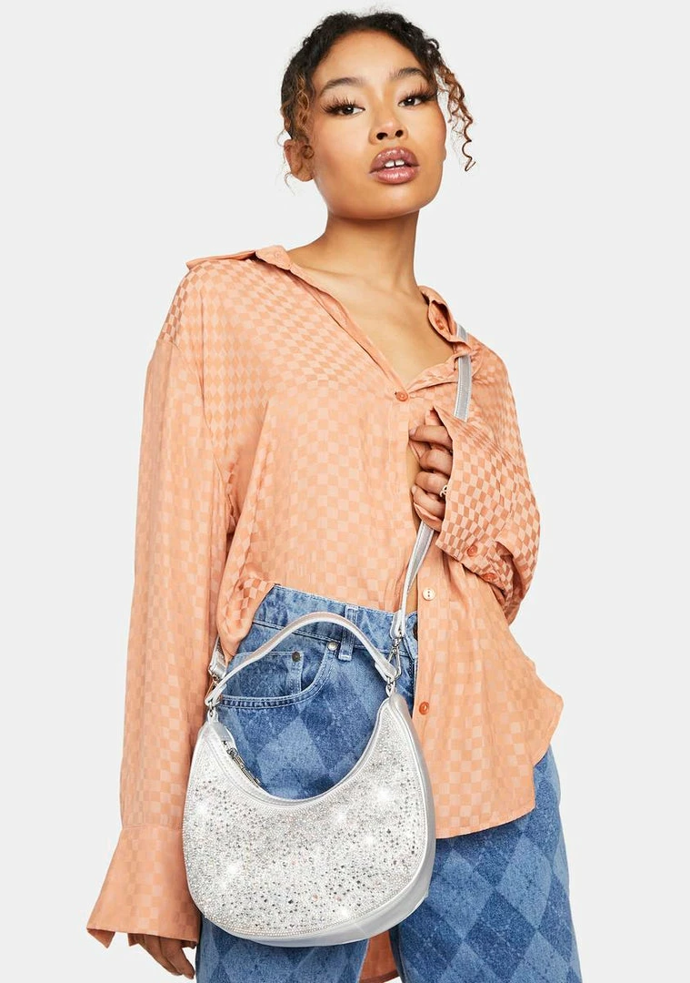 cuz it’s all about style. This crossbody bag has a top zip closure, a carrying handle, an adjustable shoulder strap, and is covered in glitter.
