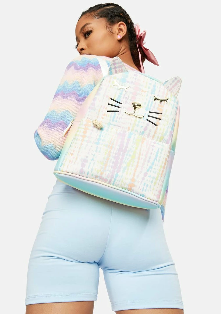features a classic betsey johnson kitty ears and face design, tie dye pattern all over, and front pocket.