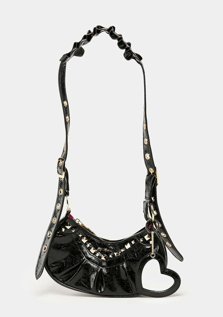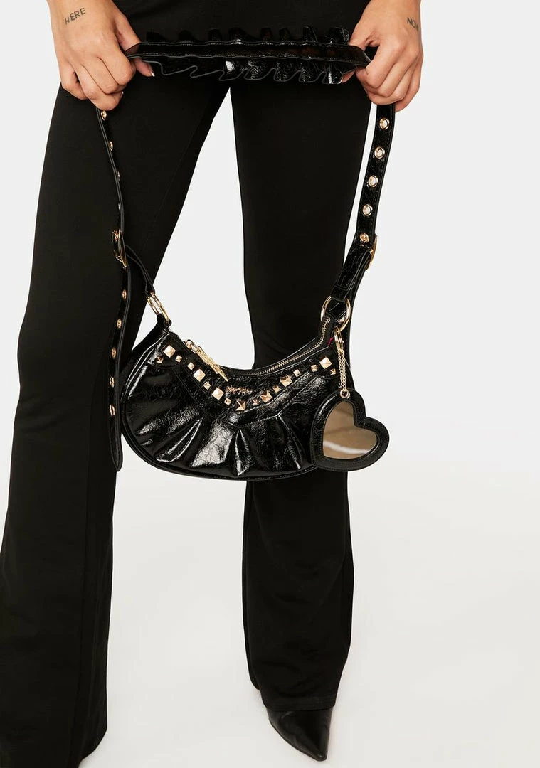 who’s the baddest of them all? This crossbody bag comes in a patent vegan leather construction, in a baguette style, with stud details, adjustable buckle straps, a zip closure, and heart shaped mirror keychain.