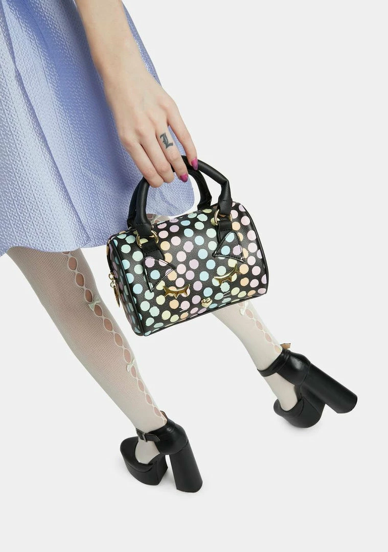 features a pastel polka dot print, lil kitty ears, metallic gold plated kitty features, and a double strap handle.