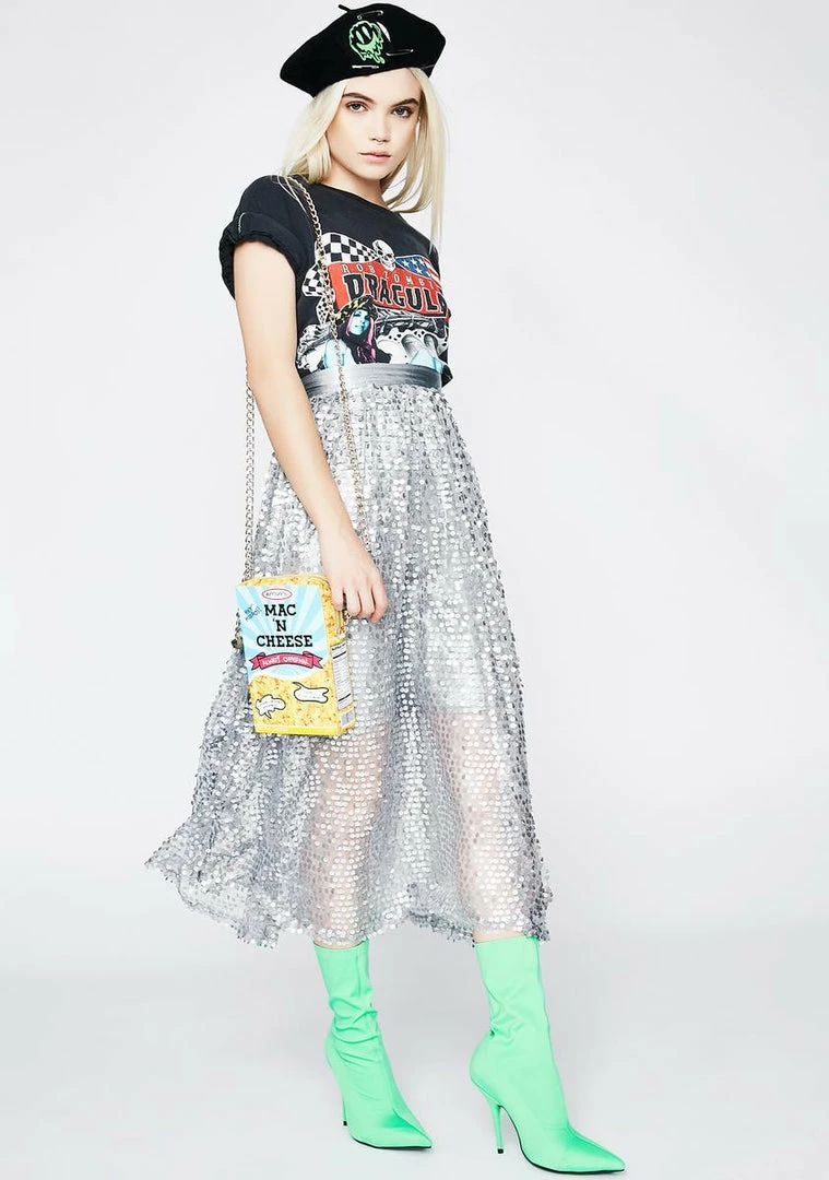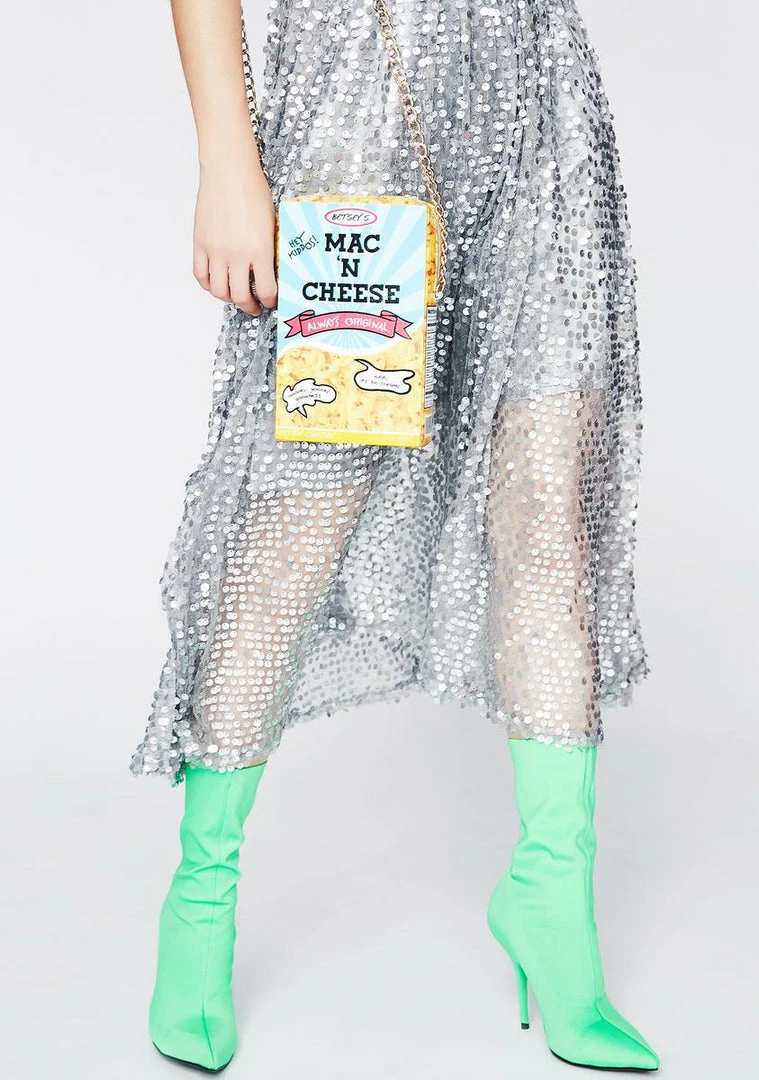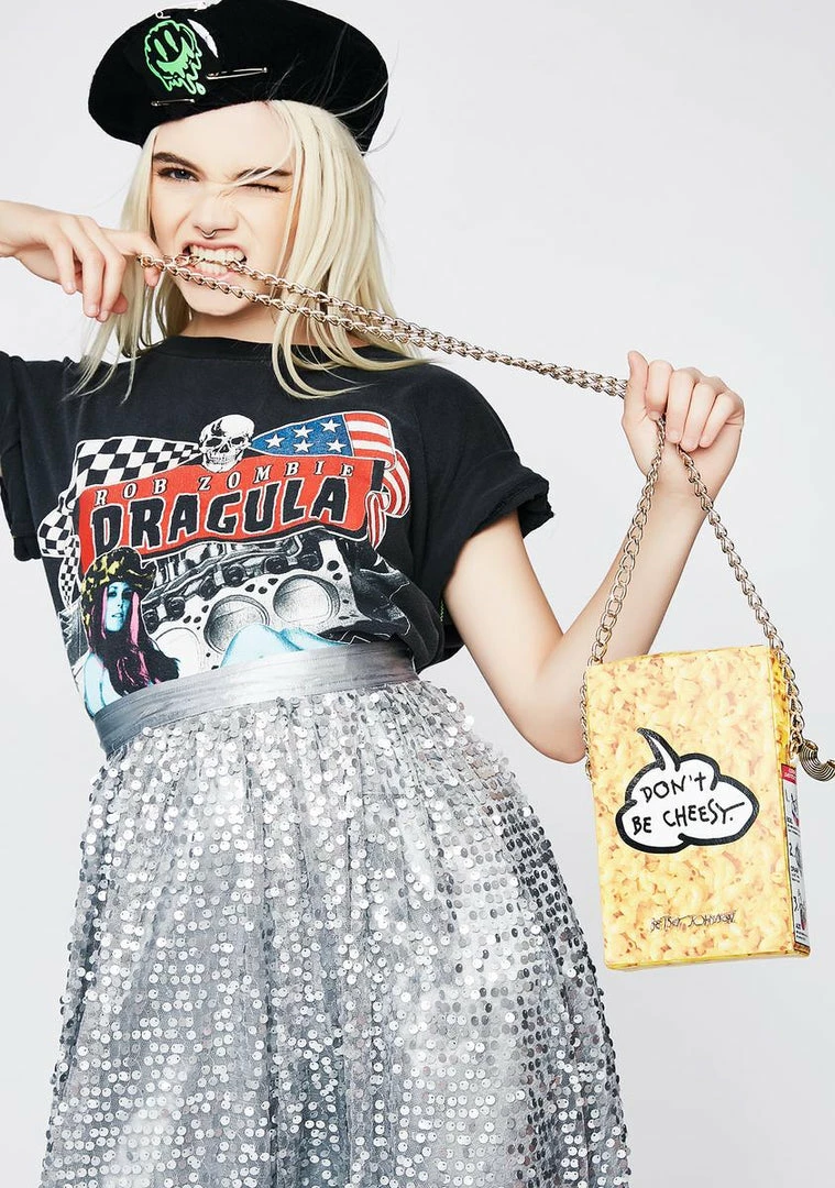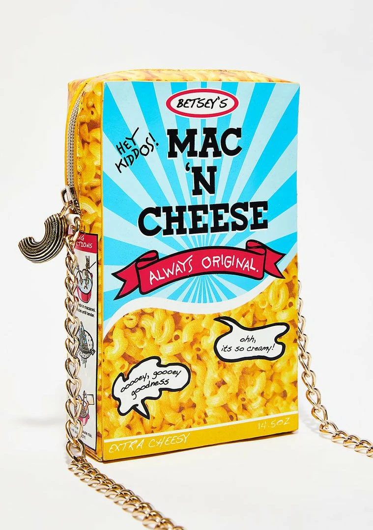 cuz everyone loves that gooey goodness. This mac Nรขยย cheese box shaped crossbody has a box of mac graphic all ova, a gold-tone chain strap and a zip closure.