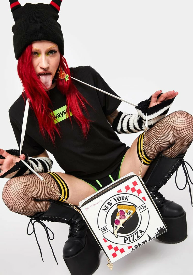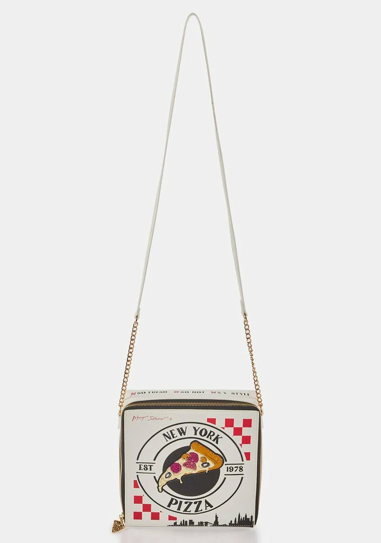 cuz get it while itΓ’ΒΒs hot. This crossbody bag is in the shape of a pizza box, has a shoulder strap, and an all around zip closure.