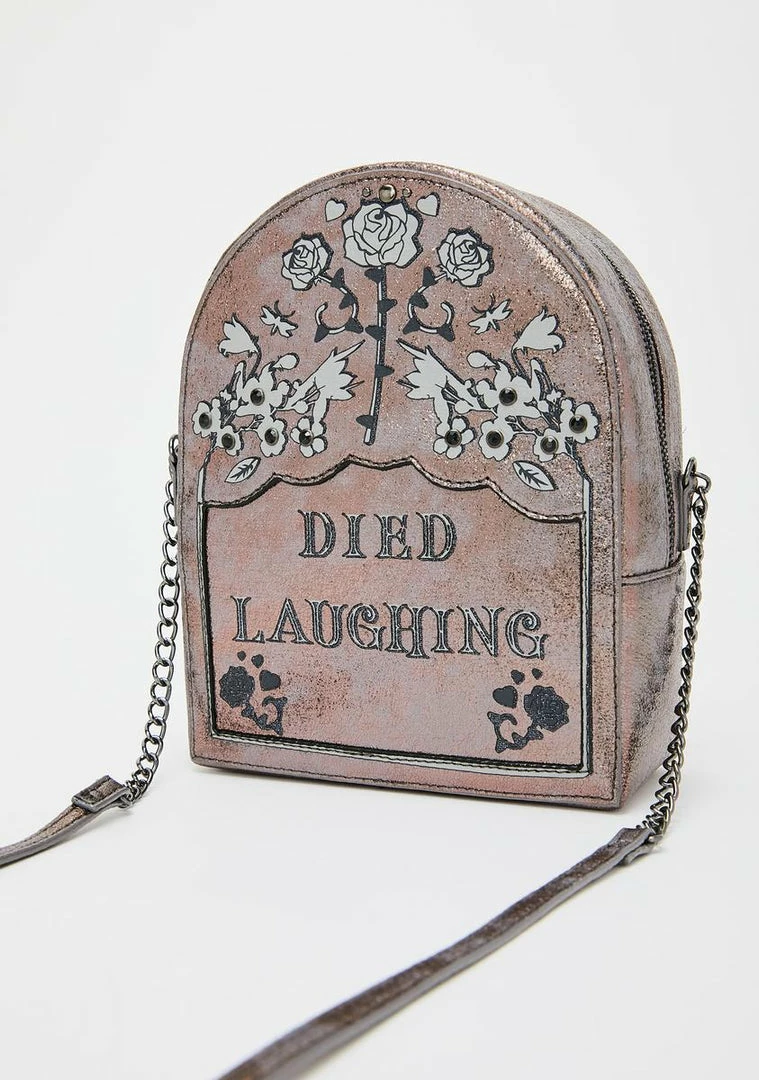 cuz thatâs how we all want to go. Die without regrets wearinâ this intricate tombstone-shaped crossbody that has an epitaph readinâ âDIED LAUGHING,â glitter PVC construction, chainlink hardware, Nâ a zip closure with a heart-shaped pull.