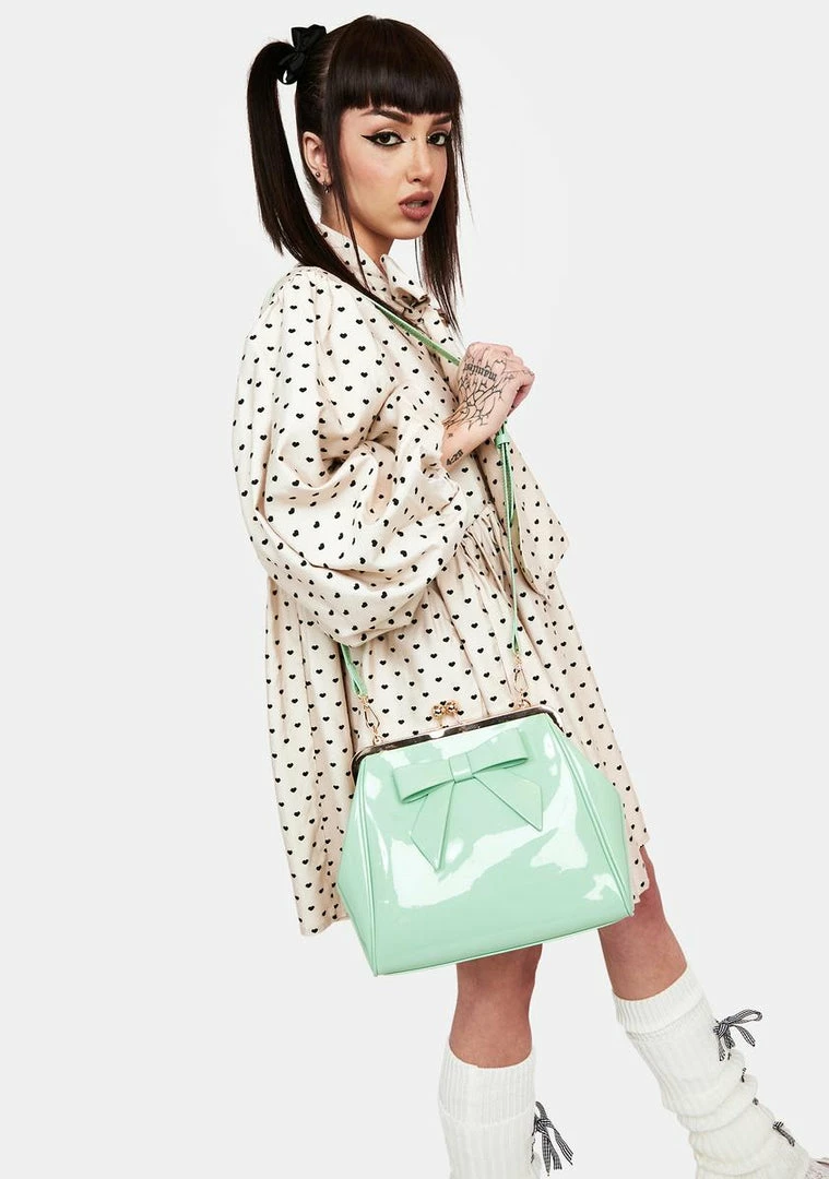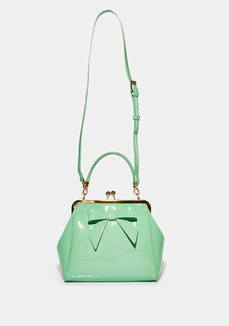 has a patent vinyl construction, a bow design at the front, top handles, a detachable shoulder strap, and a kiss lock closure.