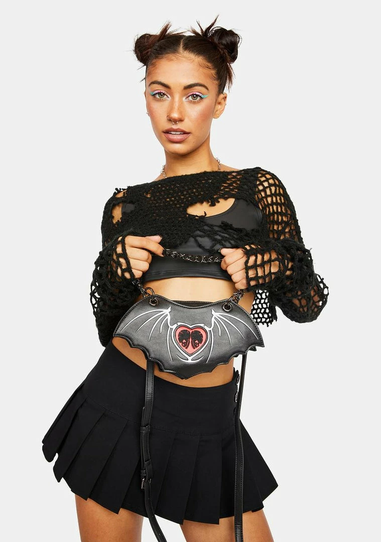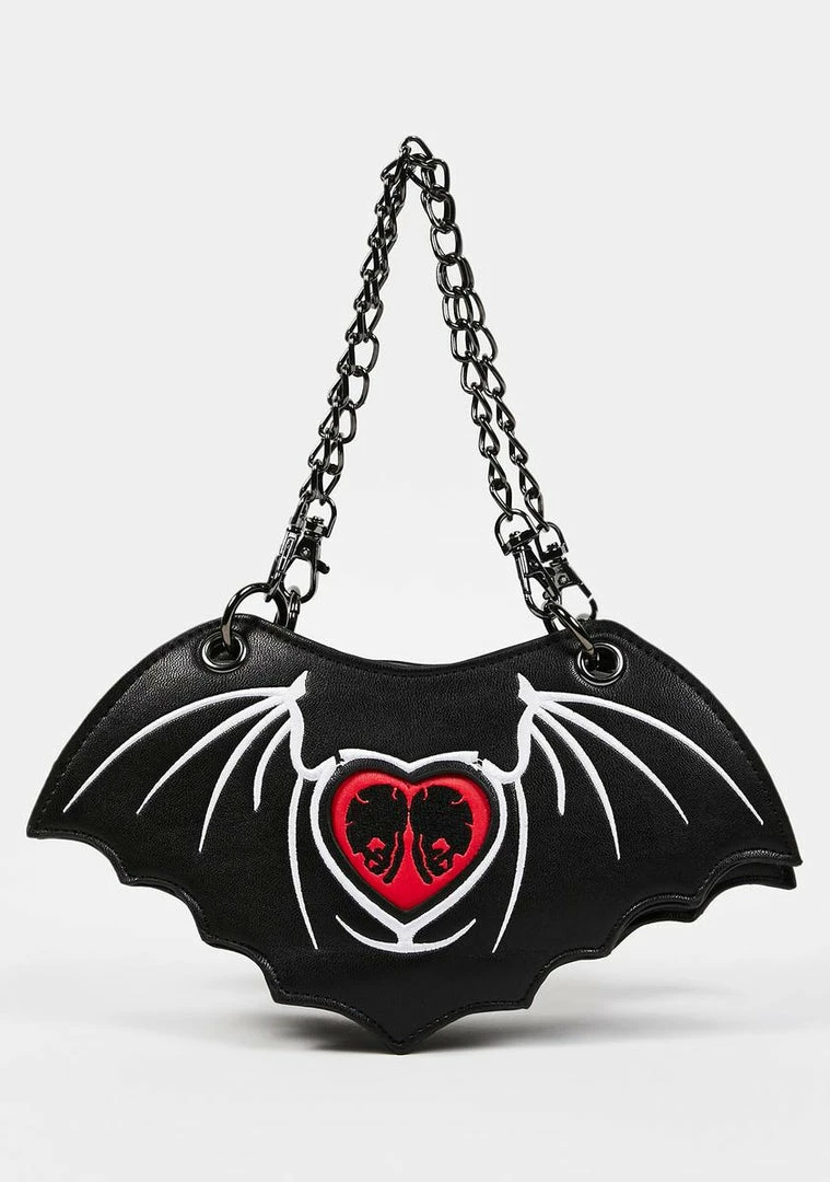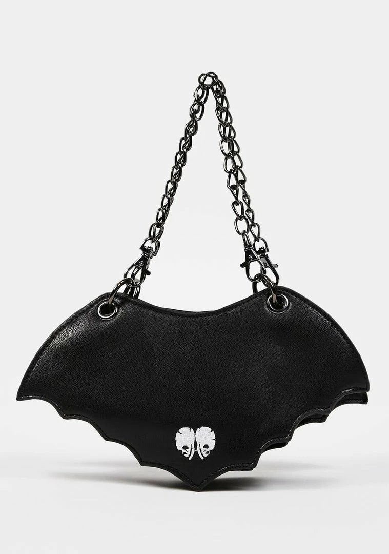 cuz youΓ’ΒΒre flying first class with the devil. This bat-shaped handbag has a vegan leather construction with embroidered graphics, chunky chain shoulder straps, a zippered compartment, and a detachable long strap.