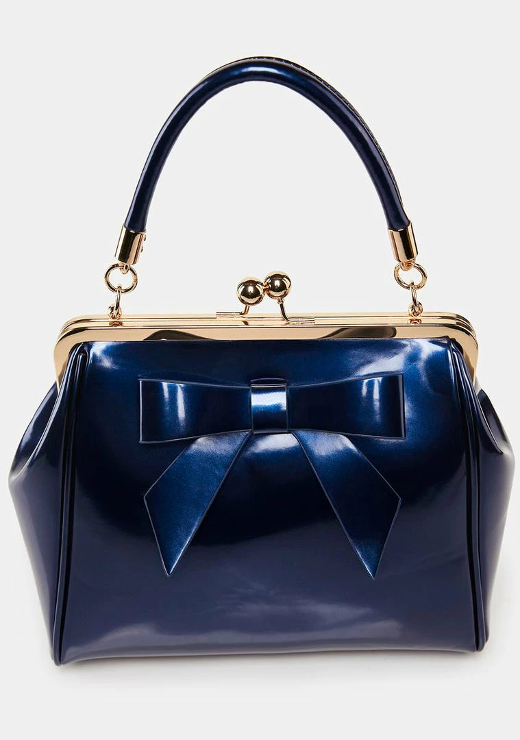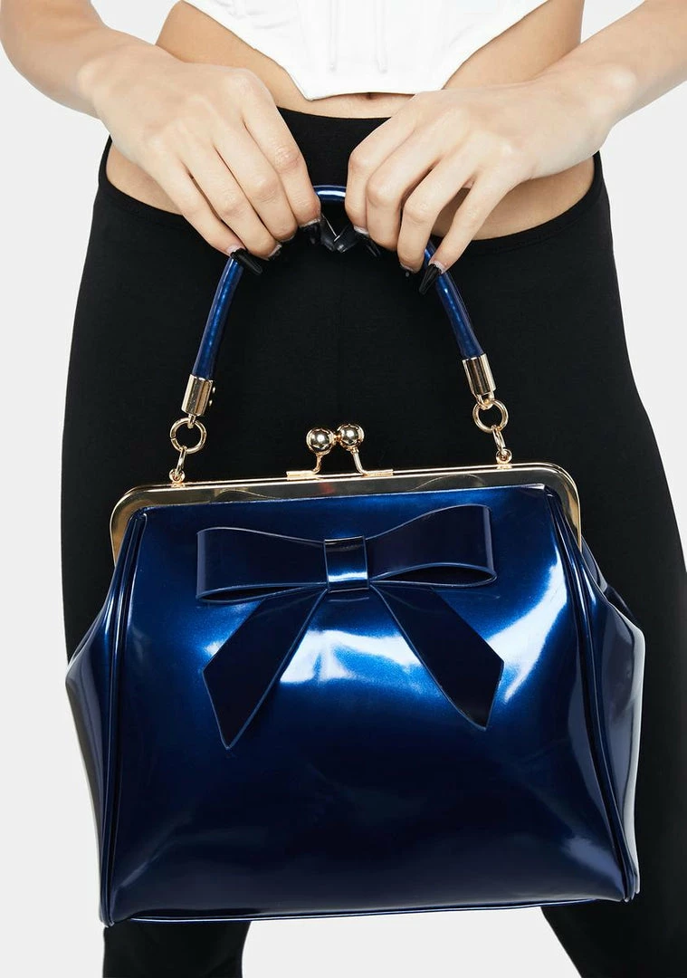 has a patent vinyl construction, a bow design at the front, top handles, a detachable shoulder strap, and a kiss lock closure.