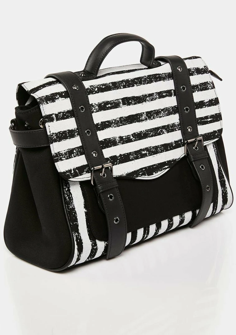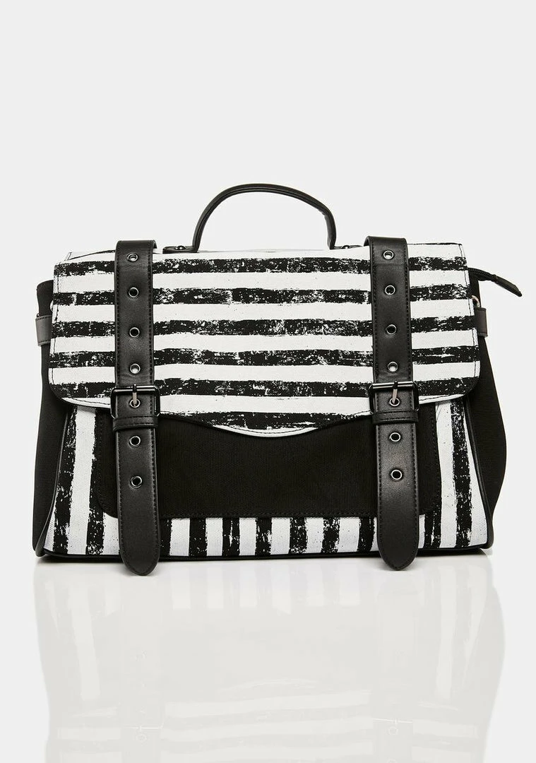 cuz the night is just getting started. This messenger bag has a striped print, vegan leather buckled belts at front, a top handle, and comes with crossbody straps.