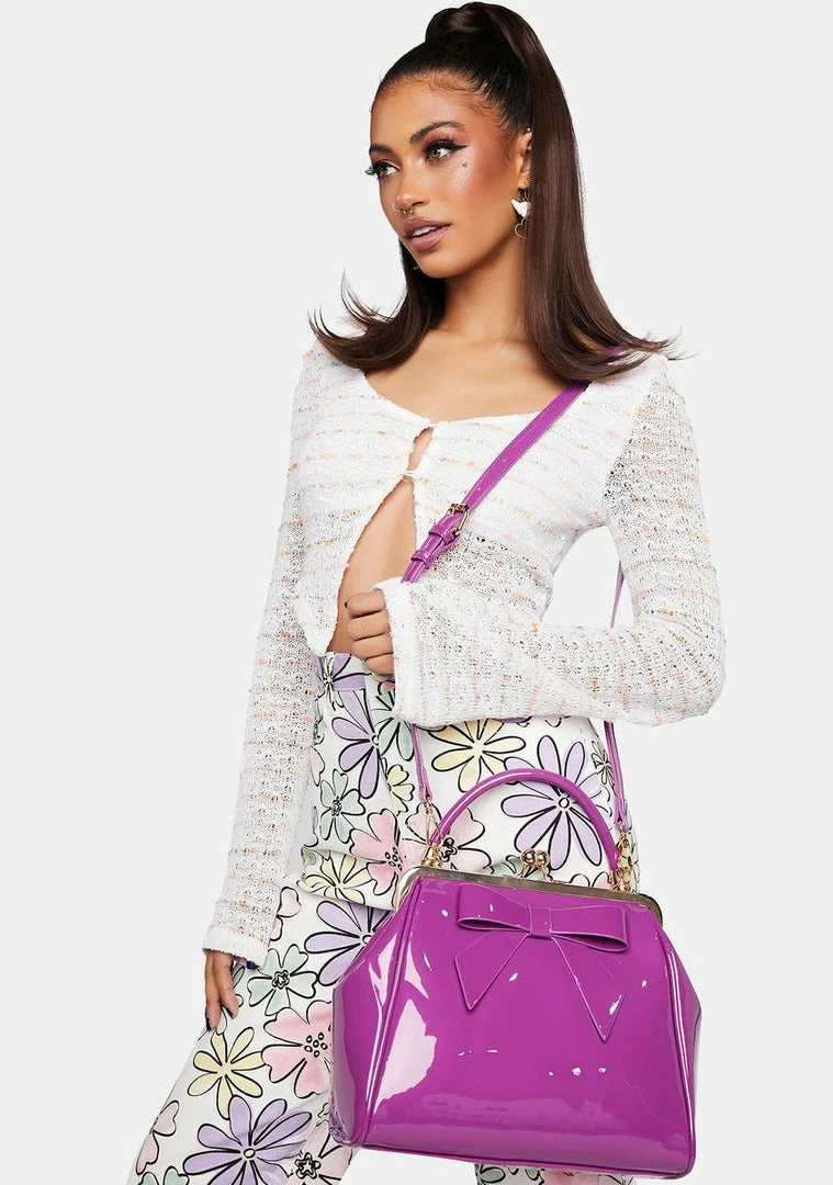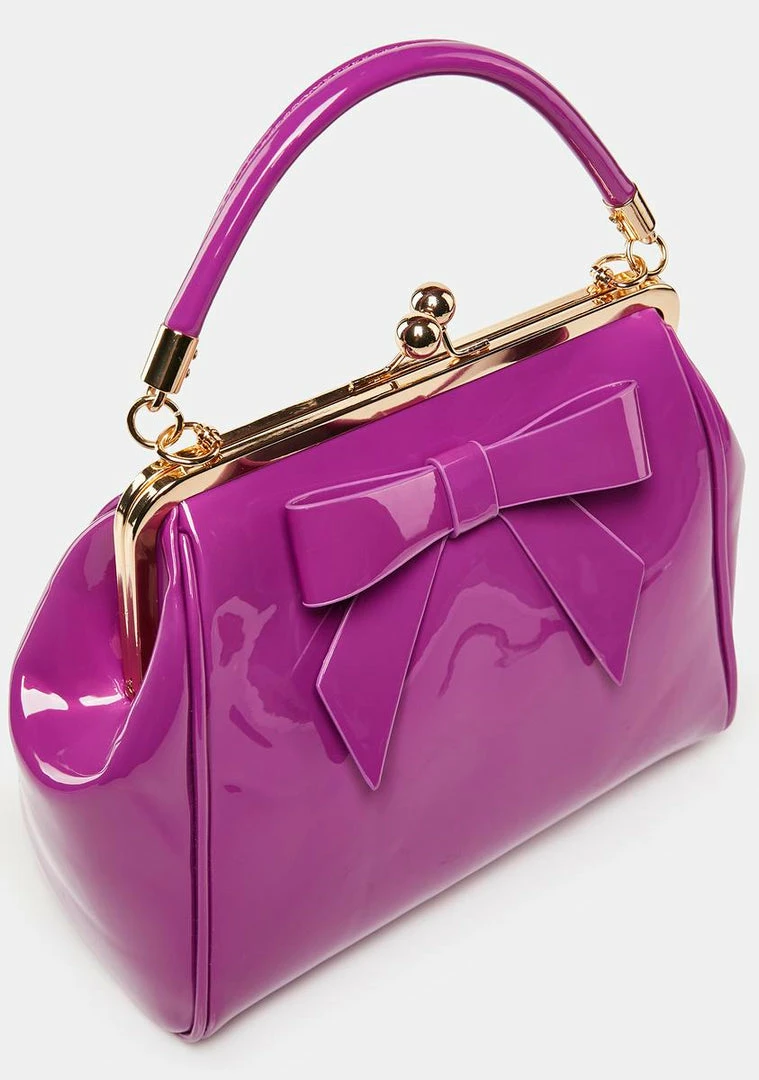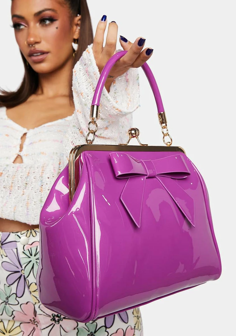 has a patent vinyl construction, a bow design at the front, top handles, a detachable shoulder strap, and a kiss lock closure.
