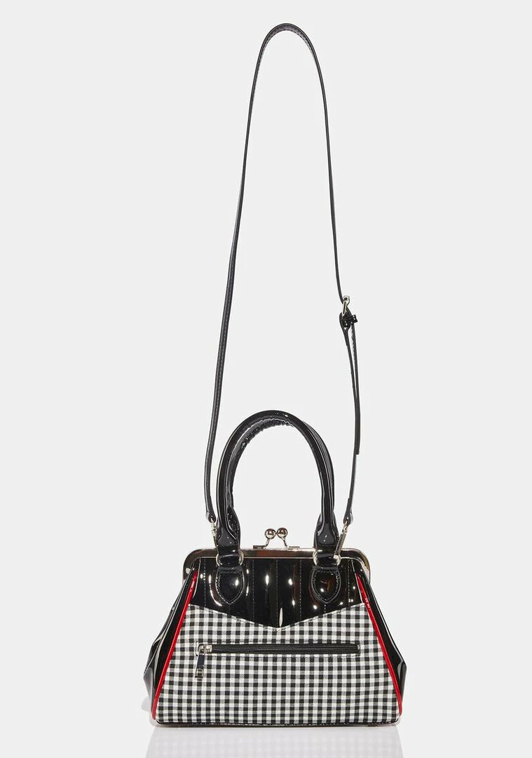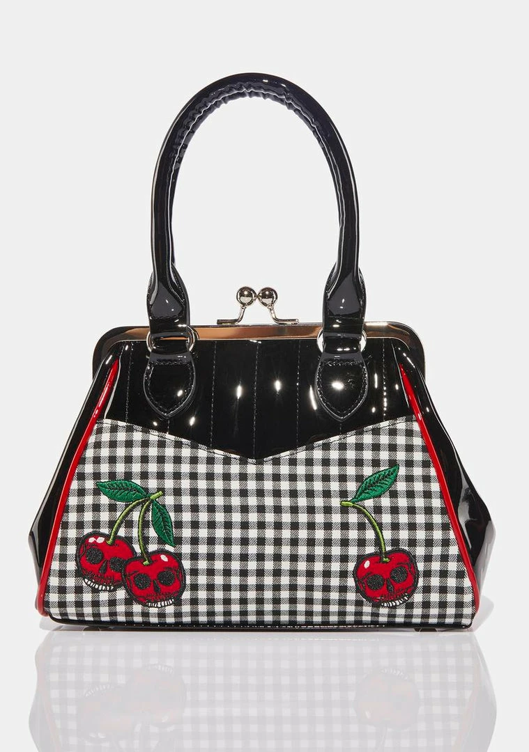 cuz youΓ’ΒΒre sweet but deadly, babe! This handbag has a vegan leather and canvas construction, a kiss lock clasp closure on top, a long detachable crossbody strap, three inner storage pockets, and a gingham print with skull cherry patches.