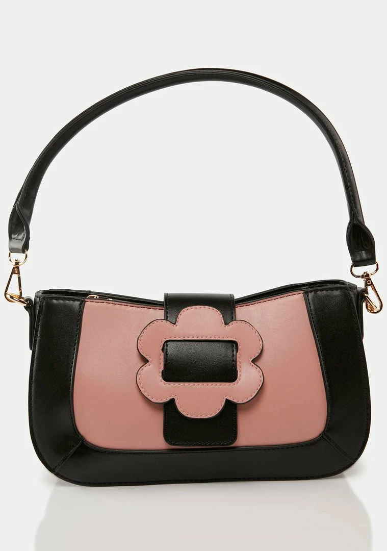 got you covered day and night. This baguette shoulder bag has a color blocked vegan leather construction, a floral-shaped detail at front with a magnetic button closure, and a removable top handle.