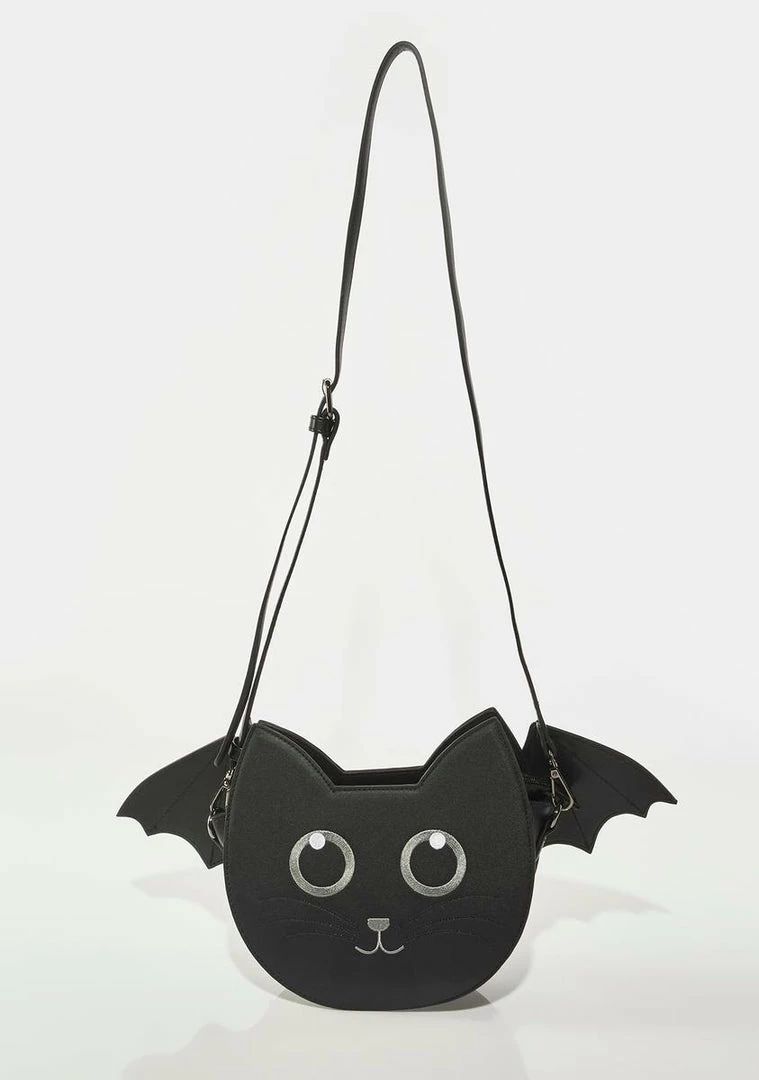 cuz you’re the purrrfect creature! This novelty cat shoulder bag has a vegan leather construction, bat wings on the sides, a long detachable crossbody strap, and a top zip closure.
