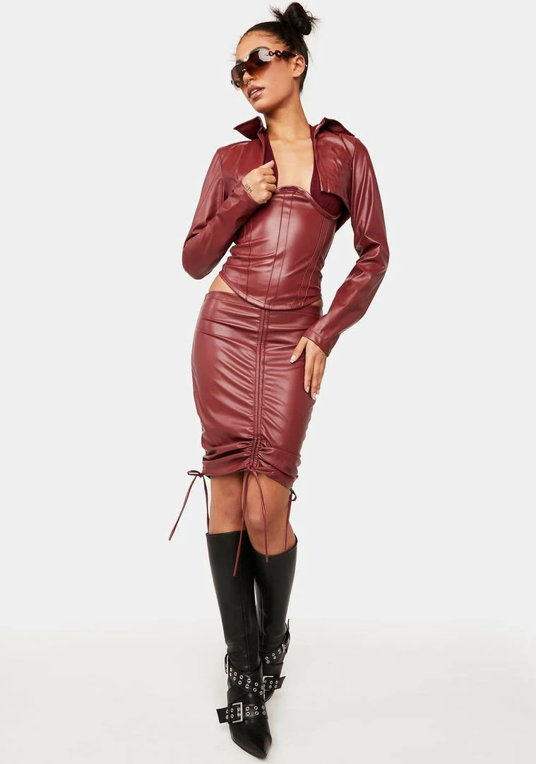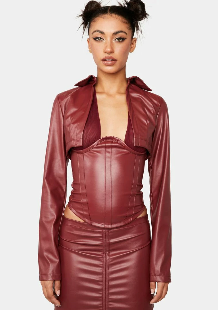 got you feelin’ bad to the bone. This burgundy ultra-cropped jacket features a non-stretch vegan leather construction, a classic collar, and long sleeves.