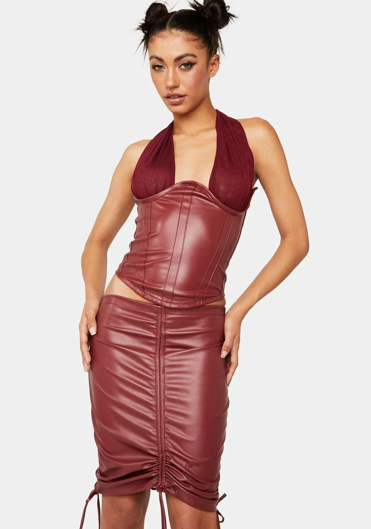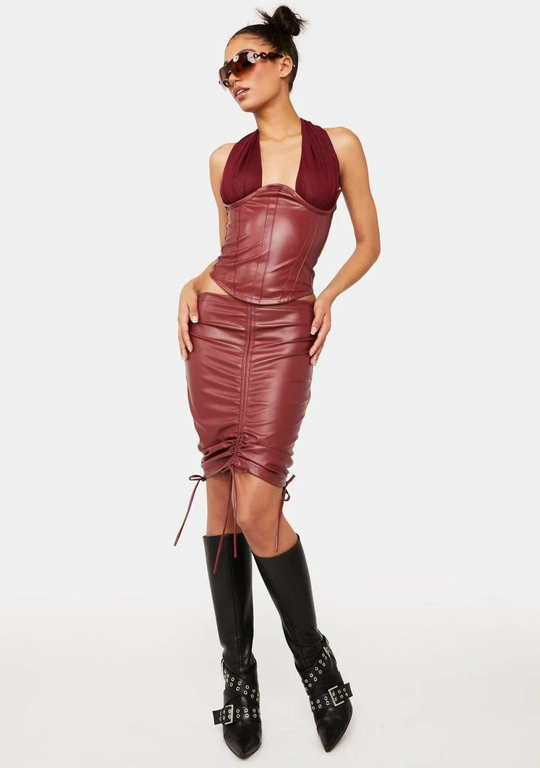 got you feelin’ bad to the bone. This burgundy mini skirt features a vegan leather construction, adjustable cinched ties at the front and side for a customizable length, and a low-rise silhouette.