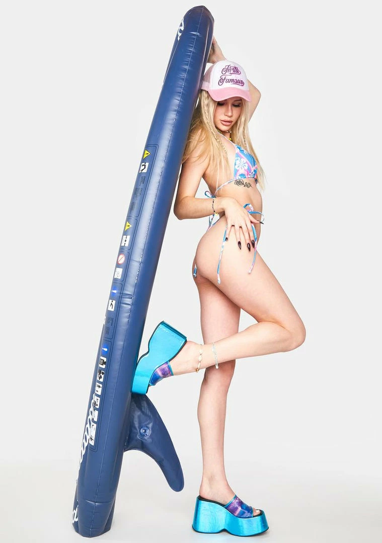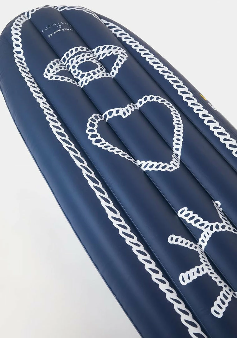 where’s the pool party? This inflatable floatie has a surfboard-shaped construction, eye, heart, and sun graphics printed at front, and comes with a repair patch in case of punctures.