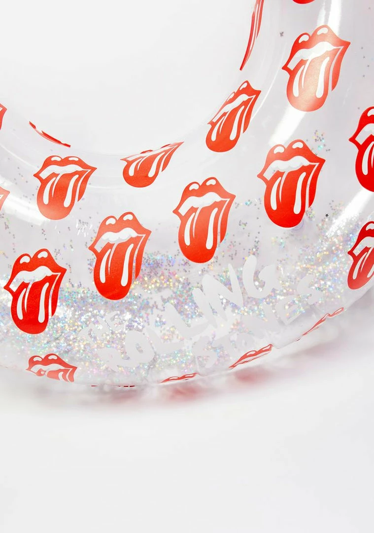 it’s gonna be a rock n’ rolling summer! This clear PVC inflatable pool ring has an iconic Rolling Stones design with holographic glitter inside and comes with a repair patch in case of punctures.