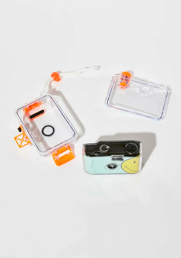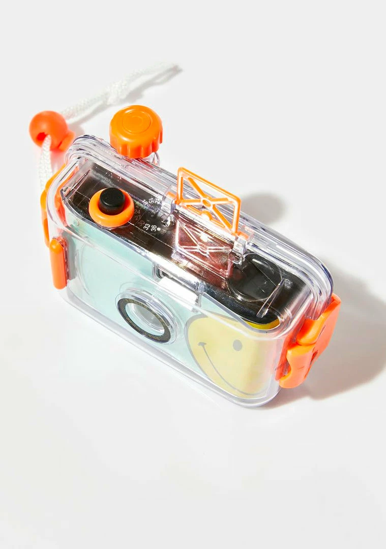 smile, you’re on camera. This camera comes with a detachable waterproof case, requires 35mm roll, and has a happy face detail on the front.